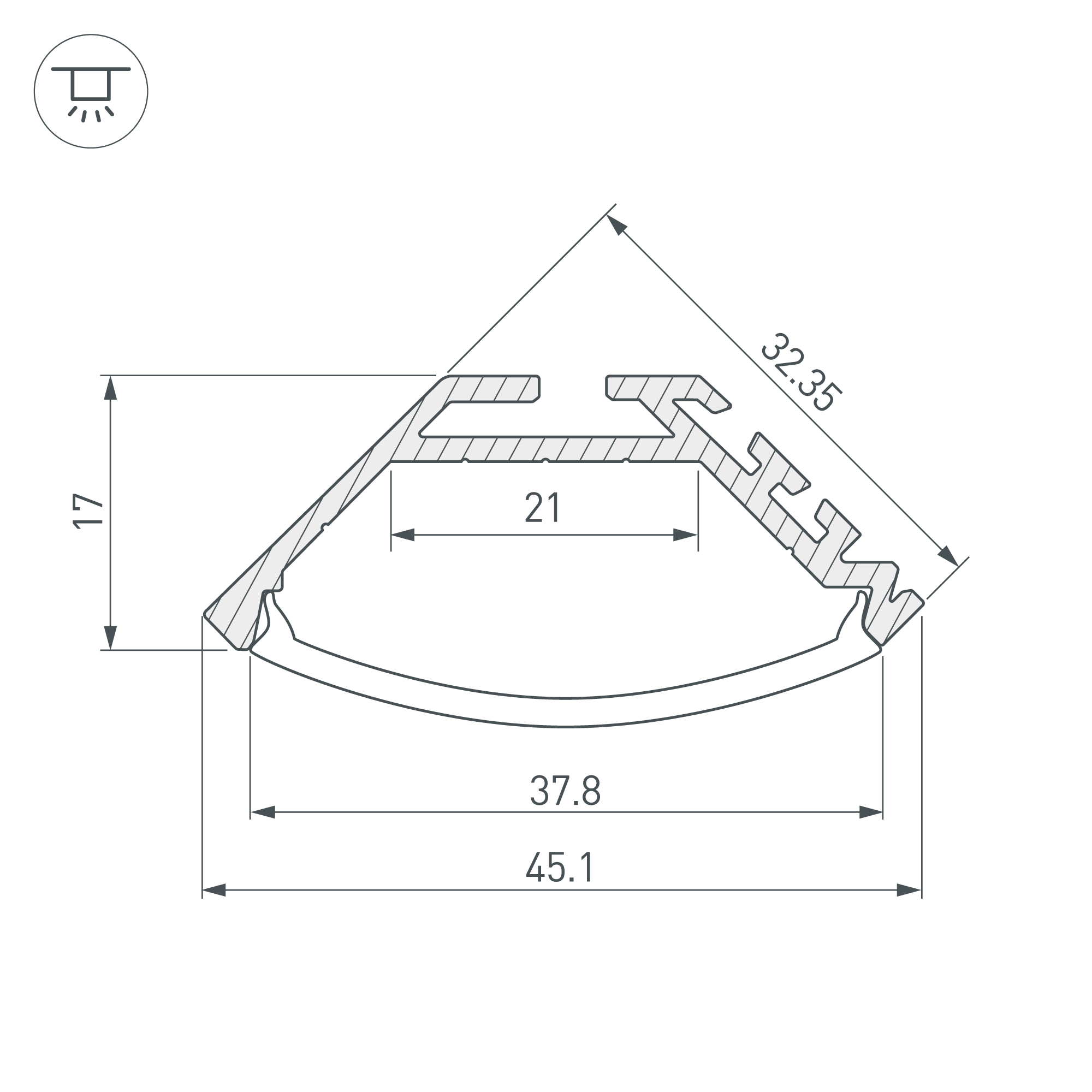 Габаритные размеры (L×W×H): 2000 x 45,1 x 17 мм. Ширина площадки для ленты 21 мм.