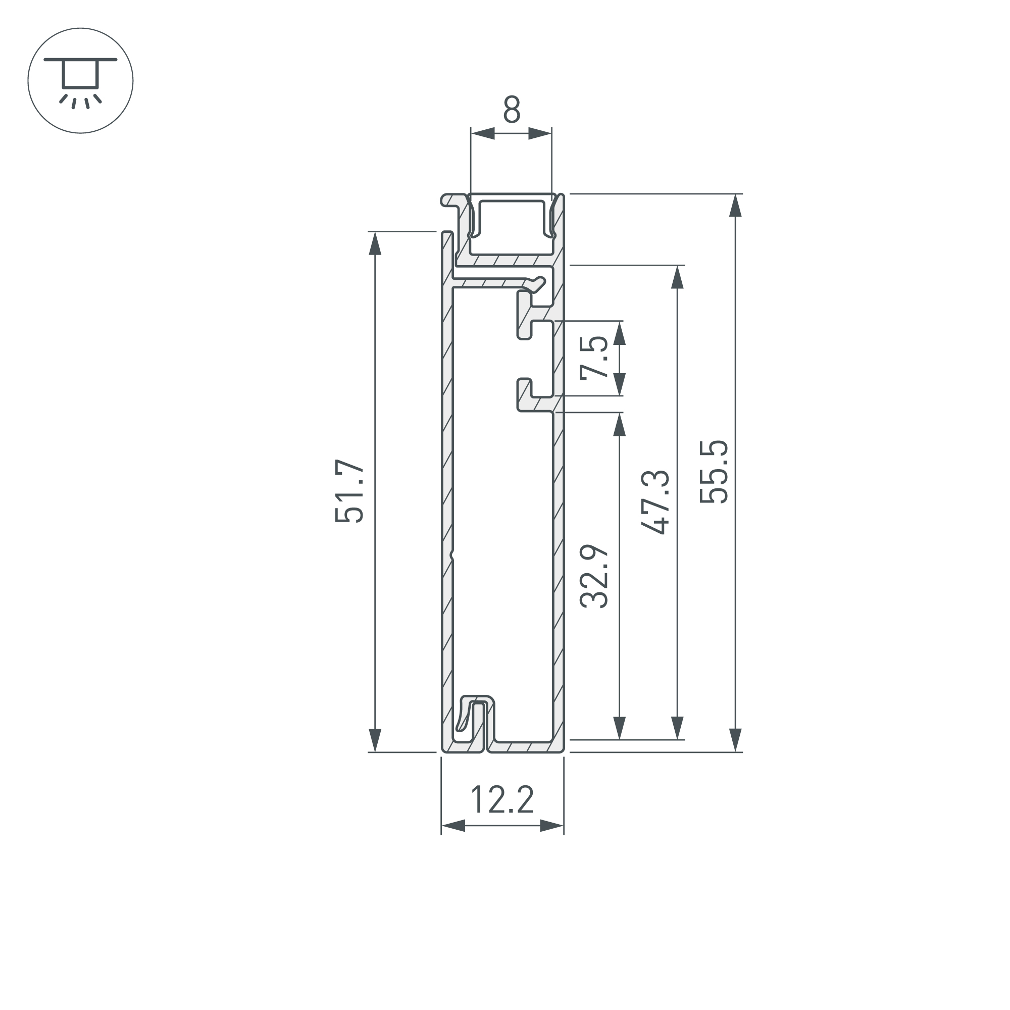 Накладной двухкомпонентный профиль-плинтус из анодированного алюминия с кабель-каналом для контурной подсветки помещения. Габаритные размеры этого профиля составляют 2000 мм в длину, 12,2 мм в ширину и 55,5 мм в высоту. Площадка для установки светодиодных лент позволяет использовать ленту шириной до 8 мм и мощностью до 30 Вт/м. Это обеспечивает гибкость в выборе светодиодных лент и создает потрясающие световые решения.