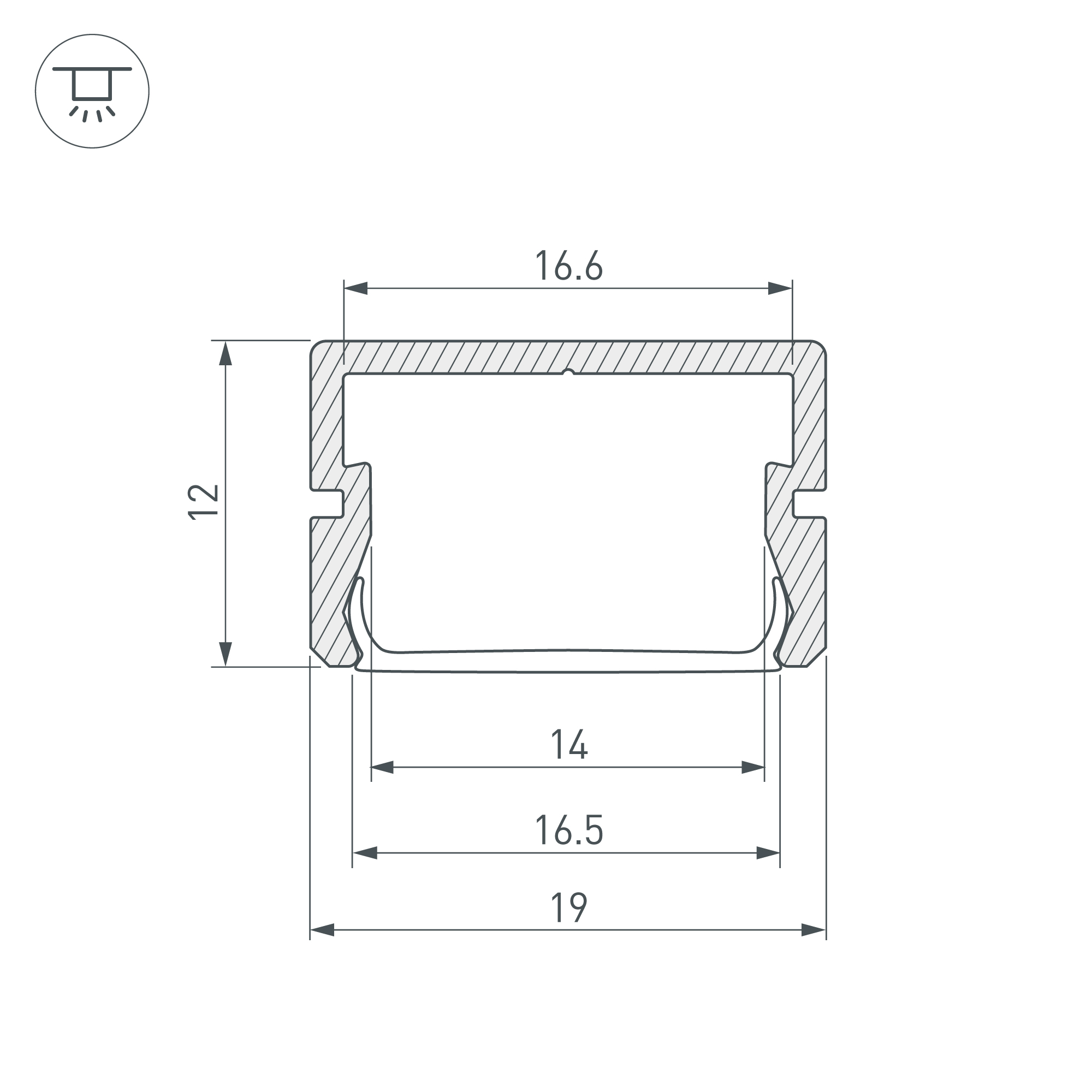 Габаритные размеры (L×W×H): 2000 x 19 x 12 мм. Ширина площадки для ленты 16 мм.