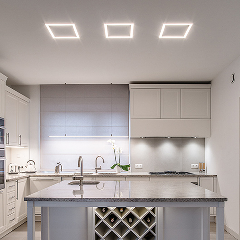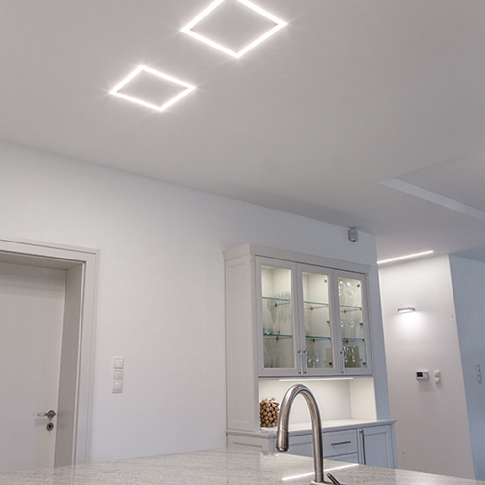 Создание световых полос без видимых алюминиевых частей в гипсокартонных системах. Профиль с широким фланцем приклеивается к гипсокартону, затем скрывается шпатлевкой, красится. При использовании с объемными экранами G-K, G-L необходимы дополняющие заглушки.