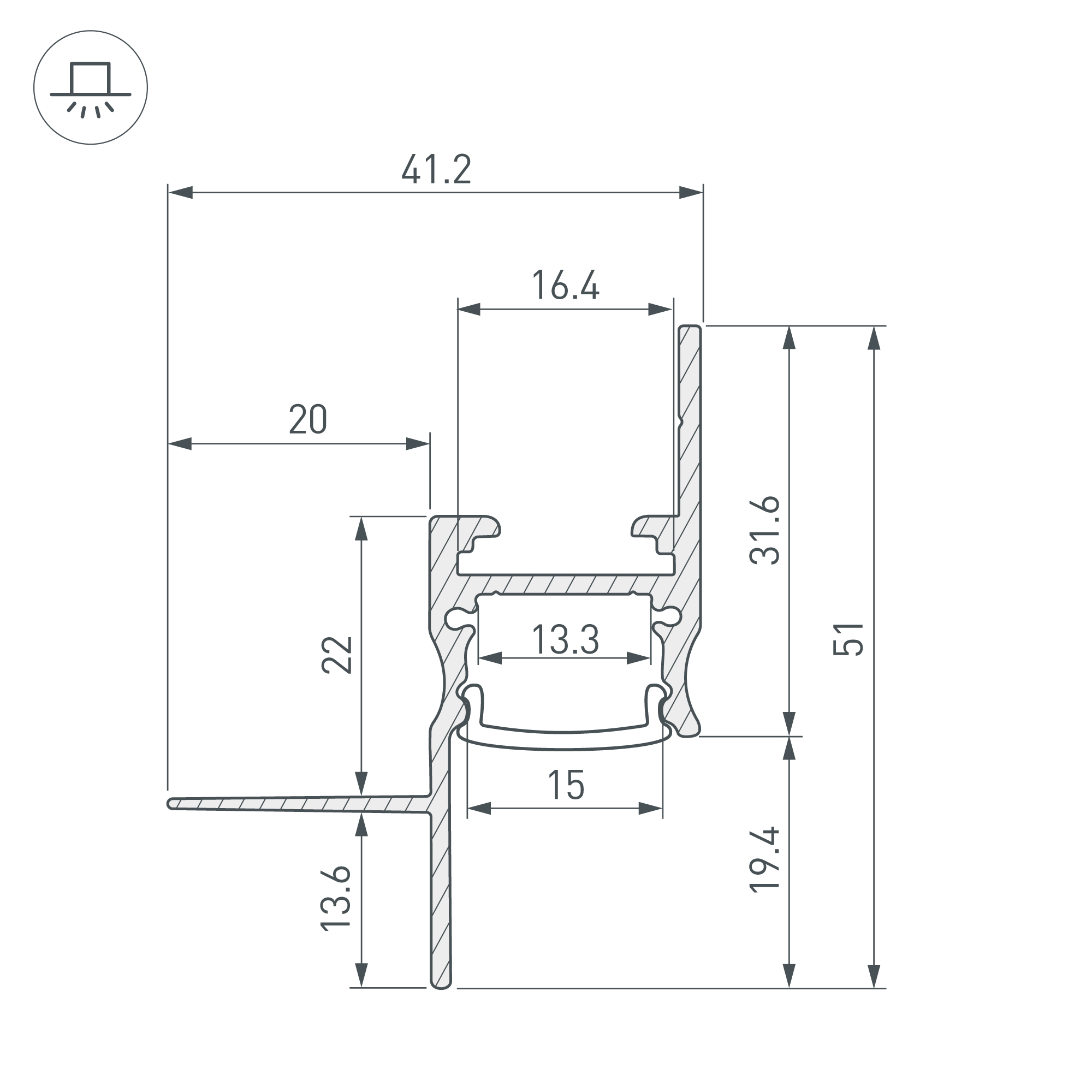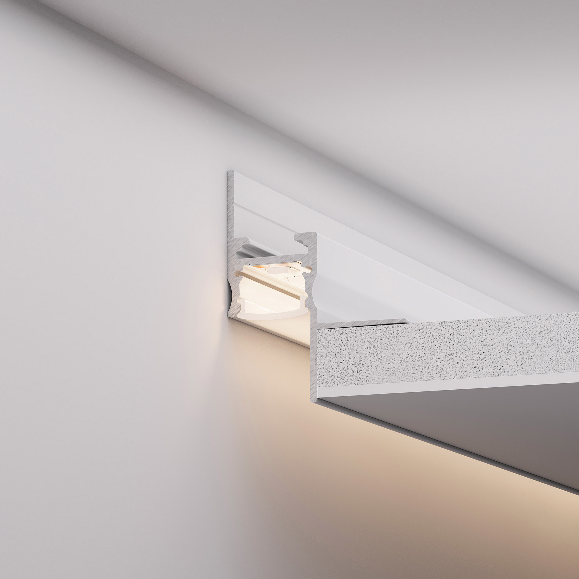 Профиль со скрытым фланцем встраивается в потолки и потолочные ниши из гипсокартона, образуя теневой зазор между потолком и стеной. Такое решение создает визуальный эффект потолка, парящего в воздухе с мягким свечением по периметру комнаты.