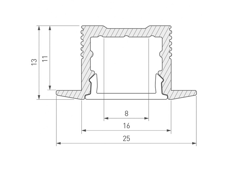 Габаритные размеры (L×W×H): 2000 x 25 x 13 мм, паз для установки 16 мм.